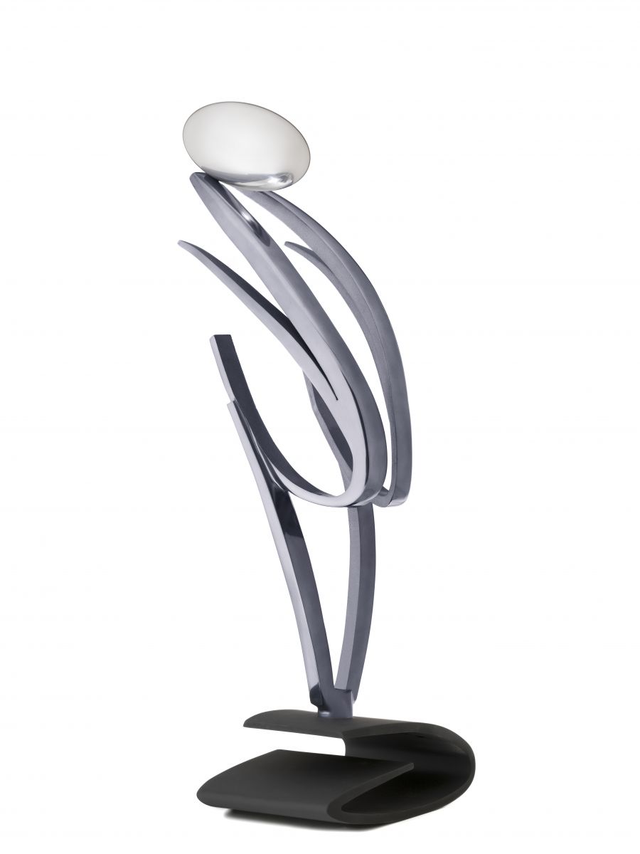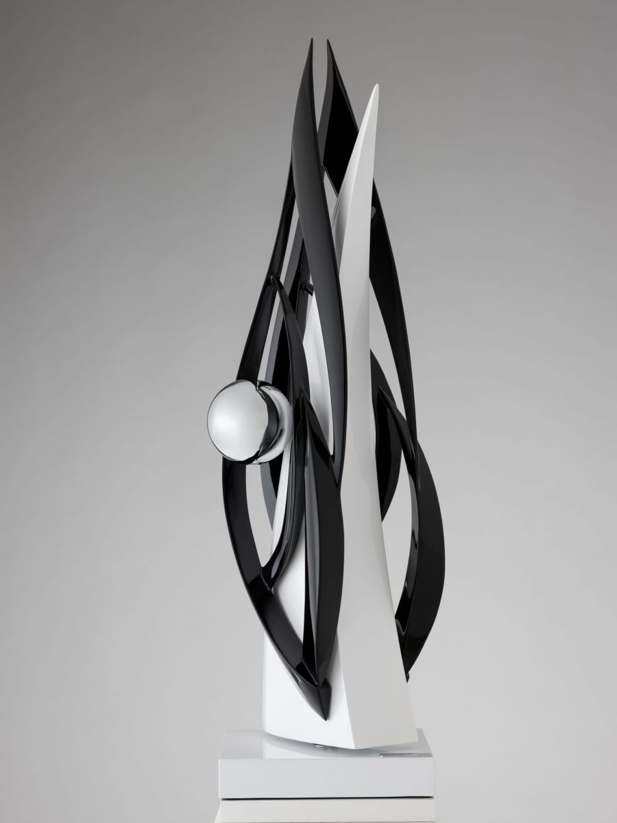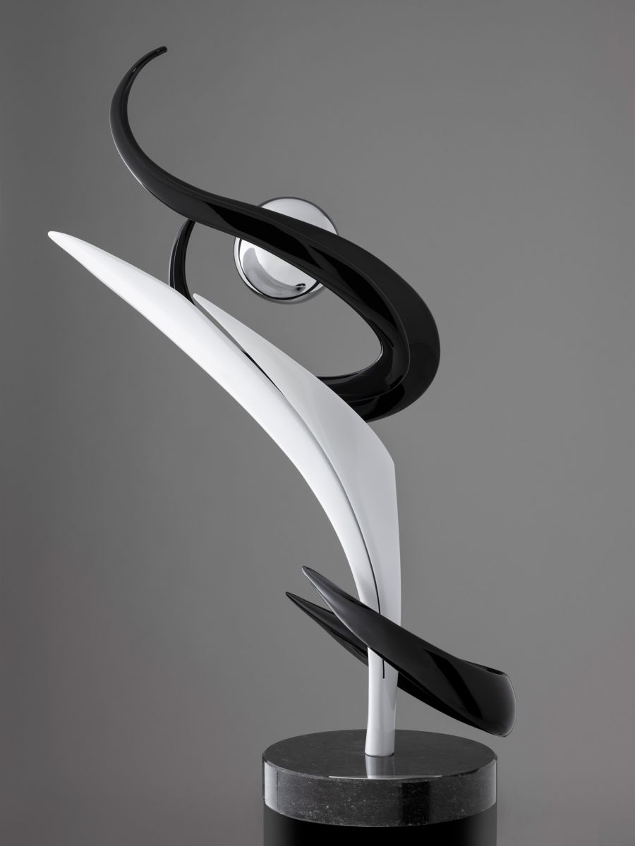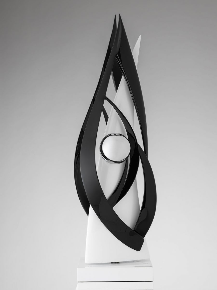 The inner part of the sculpture is characterized by a sail on which cutting blades stand out, reaching a ball that brings together “two souls” of the artwork.